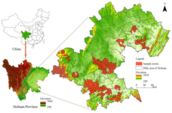 In recent years, PLEL has attracted widespread attention from governors, planners and scholars for promoting sustainable economic and social development. Based on the system theory of the element–structure–function analysis framework, land use types are classified into single or compound types of PLEL through qualitative and quantitative identification of LUFs, and then the multi-scale and multi-level classification system of PLEL are established [15,16]. The research scale can be divided into three levels; the first is large-scale, and Zhang et al. [17] and Liu et al. [14] have constructed the national classification system of PLEL in China and revealed the spatial pattern of PLEL. The second is the medium scale, mainly taking provincial-level regions, large river basins and urban agglomerations as research objects, covering Hubei Province [2], Chongqing province [18], Jiangsu province [19,20], Yangtze River basin [21,22], Bailongjiang River basin [23], Fujian Delta urban agglomeration [3], Jianghuai urban agglomeration [24], and Wuhan urban circle [25] in China. The third is the small scale; the main research objects are county-level regions in China’s main ecological regions [26,27,28,29,30,31,32]. Li et al. [33] and Xi et al. [34] have carried out the classification system and quantitative identification of PLEL at the rural level. Nevertheless, the concept and classification system of PLEL have not yet been unified. Many classification systems are too conceptual and theoretical, and there are still defects in linking them with the current land use classification system. Meanwhile, there are generally fewer research samples at the county scale or below, and the representation of the research results needs to be further confirmed. Besides, there is still a lack of PLEL research in Sichuan Basin. This study has built a three-level classification system of PLEL, based on the main functions identification of LUFs (production, living and ecological functions). Taking 215 typical towns in the hilly area of Sichuan Province, Southwest China as samples, the quantitative, spatial, and functional characteristics and impact factors of PLEL were studied. The results of this study provide valuable information for the optimal allocation of PLEL and sustainable development in the Sichuan Basin and upstream of the Yangtze River.