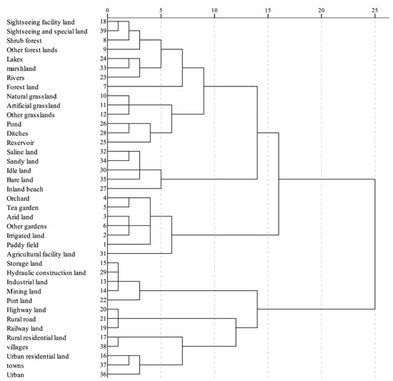 The results of hierarchical clustering analysis show that (Figure 2) when the distance between groups is about 14, land use types can be divided into four categories, which correspond to ecological function, agricultural & forestry production function, industrial & mineral production function, and living function. After proper merging, the identification results of PLEF for land use types were obtained (Table 2).