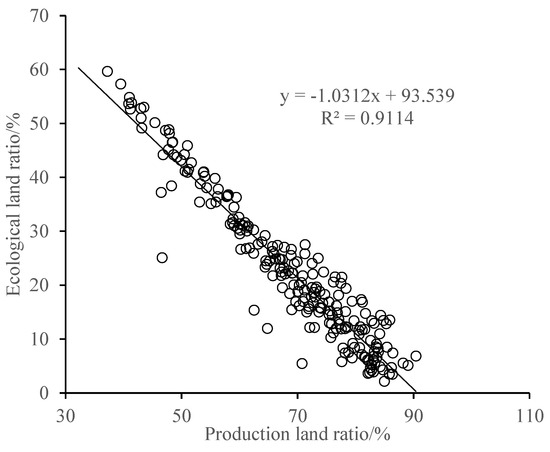 Scatter plot of the relation between ecological land and production land (n = 215).
