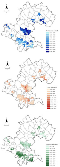 Land use functions (LUFs) are defined as the private and public goods and services provided by the different land uses, summarizing the most relevant economic, environmental and societal aspects of a region [9,10,11,12]. The LUF concept, with its roots in agriculture, ecosystem goods, and services and landscape functions, has been integrated into nine categories in the SENSOR (Sustainability Impact Assessment: Tools for environmental, social and economic effects of multifunctional land use in European regions) project. According to LUFs, land use systems can be categorized into three classes: productive land, living land, and ecological land; namely, production–living–ecological land (PLEL) [13,14]. Production land (PL) is related to industrial structure and refers to the main function of providing industrial products, agricultural products and service products. Living land (LL) is related to carrying and maintaining human settlements and refers to the main functions of providing human living, consumption, leisure and entertainment. Ecological land (EL) is related to the natural ecosystem and refers to the main function of providing ecological products and services, playing an important role in regulating, maintaining and ensuring regional ecological security [5]. The three classes of PLEL are closely related, mutually transformed, and constantly exchange material and energy. The EL is the foundation, PL is the driving force, and LL is the link of PLEL [4,13].