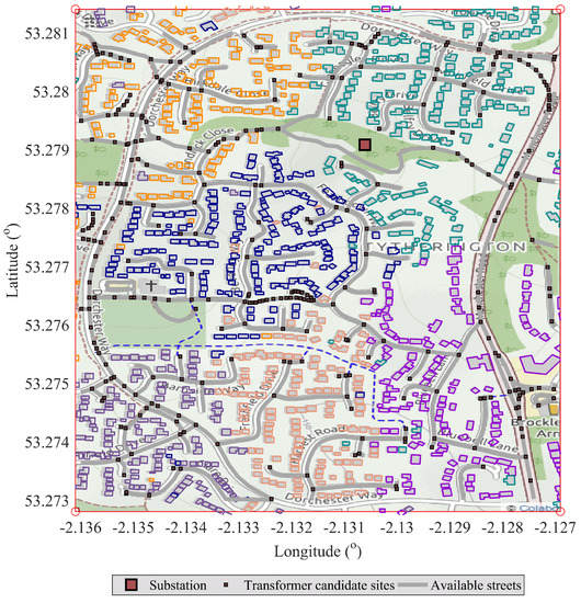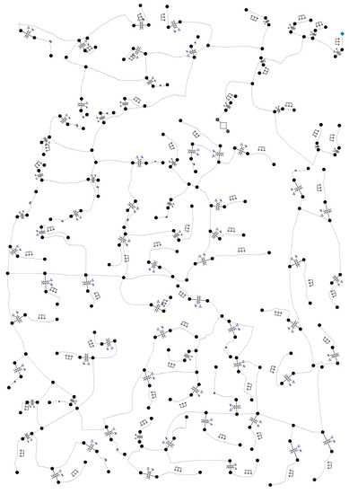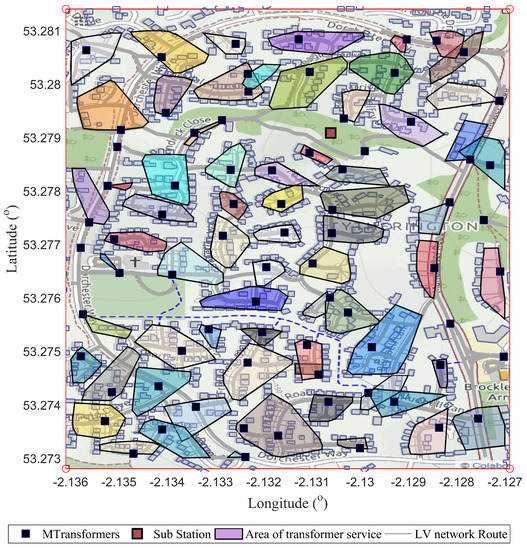 The LV network was designed through Algorithm 2, optimal routing of a LV grid network, explained in the sections below. The obtained result is presented in Figure 6, there is shown the georeferenced scenario with LV network implementation and irregular polygons sketched in the graph, delimiting the transformers area of service. The end users with 100% connectivity are connected to the LV network through the operator service cable. Those cables connect the home nearest point to the corresponding nearest street point; this calculation is included in the model. The distance in the LV network includes the length from house to the street and from that point down the street to the transformer. The model for the LV network design is subject to the application of distance restriction.