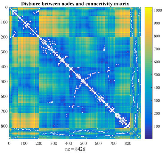 The optimization applying graph theory is based on the connectivity matrix. The connectivity matrix of the presented scenario A is shown in Figure 3, where is seen a symmetrical square matrix of N+M+S elements. Where N is the number of end users, M is the number of activated transformers and S is the substations number. In order to find the connectivity matrix, the distance matrix is calculated, which as shown in the graph represents the distance between homes to homes, homes to transformers, homes to the substation and finally transformers to the substation. The color in the matrix represents the distance, for instance, a dark color means a closer distance compared with a light color. Moreover, the white dots illustrates the possible connections between nodes, the white dots are located whether the restriction distance is accomplished. The number nz in the bottom of the figure is 8426, which represents the number of total connections in the studied scenario. There are two extreme fringes in the figure, the right and the bottom one; those fringes represent the connection between transformers and end users. Notice that the form of the fringes changes respect to the rest of the figure, mainly that there are more white dots which means the higher connection possibility between transformers and end user. This is due the optimal transformer allocation. Besides, the principal diagonal consideration must be considered, because it represents the distance between the same node, and it must be changed for a greater distance in order to do not obtain erroneous model results.