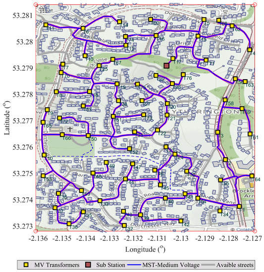 The Algorithm 1 has five steps.The first declares the variables, distance R and the capacity number Cap restriction to zero, or receives the georeference information from the map, including the latitude and longitude of end-user, candidate sites and substation location. The information was taken from an OpenStreetMap (OSM) file, including the georeferenced information about the houses’ shape, main routes, streets, public spaces, and more. Step 2 determines the optimal transformer selection using Prim algorithm, which returns the number and transformer index of optimal configuration. Step 3 is responsible to find the nearest street point to customer, it is done through the distance calculation of each end-user to the each constituted point street, and determining the closest point to each home, this solution has the same number as end existing users. The fourth step searches the optimal routing of the MV grid, which used the haversine distance calculation to determine the distance between all elements in the network. After that, the connectivity matrix is calculated with the model restrictions, next the Prim minimal spanning tree is applied to find the minimum rout. The fifth step determines the cost that corresponds to the total distance of the elements of the MV network.