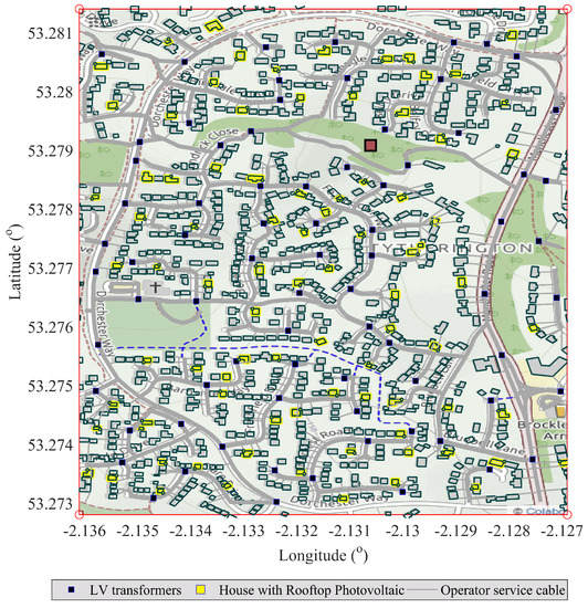 The case study is part of the EDS of the area of Tytherington in the north of Macclesfield in Cheshire, England. The limits in longitude in the present study are −2.1360 to −2.1270, meanwhile, the latitude starts from 53.2730 to 53.2810, the total area is 1.15 square kilometers. In the scenario, there are 813 loads with a total power of 5.4 MW. The presented model deploys the EDS, including the network planning expansion. Therefore, the model designs an efficient and reliable EDS, with the lowest investment cost. The network planning expansion allows us to use the initial configuration and expand the EDS with a short and medium time period. The model was developed with the algorithms one and two presented below, which was implemented in Matlab.