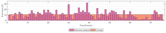 The Figure 10 shows the number of end users connected to each LV transformer, where 32 is the maximum number, and 1 is the minimum end users, the average end users connected to each transformer is 11. It can be seen that there exists a direct relationship between the power in each LV network compared with the number of connected users, and the relation between those variables is considered as linear.