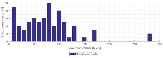 In addition, the proposed model allows planning of an MV and LV network in a georeferenced area, maintained under defined constraints and technical specifications with the minimal cost. Figure 11 presents the total number of transformer classified by the assigned electrical power. For instance, there are nine transformers of 10 KVA, four of 20 KVA, and 10 transformers with a power of 80 KVA, which is the highest amount of transformers. While the 120 KVA and 170 KVA transformers are quantitatively less than others, with one transformer, respectively. Furthermore, there are two 280 KVA transformers, which is the highest assigned power. Thus, it is demonstrated that there are areas in the scenario with high-end user density, this characteristic is a characteristic of the 30th and 39th transformers.