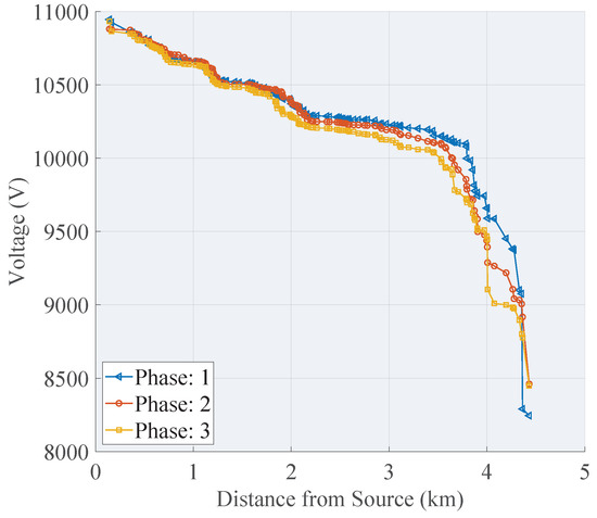 The results obtained in the scenario A were tested in electrical simulation software, the implementation is presented in the Figure 12 and Figure 13, the numeric results are summarised in Table 2. The 76 transformers are in the exact location where the algorithm determined. The simulation was development taking on account the real distance of the feeders, thus the electrical analysis is close to the real implementation. Moreover, in the Figure 12 is shown the end user voltage compared in terms of distance from the sources, where it can see that the farthest have the higher drop voltage, but they are less than the 2% compared with the source.