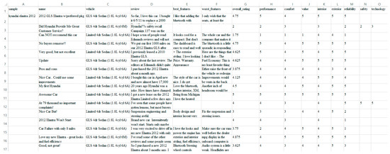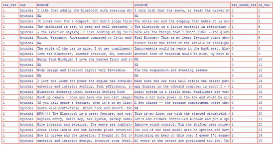 For further analysis, data was input into the R program using the “xlsx” package. This enables the R user to read, write, and format Excel files. Best features, worst features, satisfied and unsatisfied variables, reviewers’ id, name of automobile brand, and car id relative to automobile brand were included as input. Part of the input data is displayed in Figure 3.
