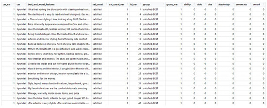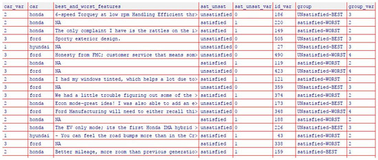 After the data were superficially arranged, R program tools were used to process the data and divide the reviews into four different groups: satisfied best features, satisfied worst features, unsatisfied best features, and unsatisfied worst features. Such segregation can be deciphered as meaning that, even though consumers may be satisfied or unsatisfied, they still identify some best and worst features of the car they are reviewing. An example of the output is presented in Figure 4, where rows are organized randomly to increase clarity.
