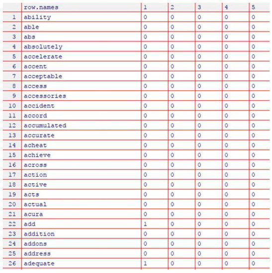 For further data analysis, the final step was to combine our primary database and database, which consisted of occurring words. Thus, with the help of R tools, a master table was created, as shown in Figure 6.