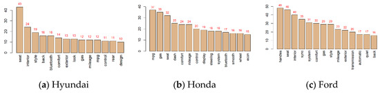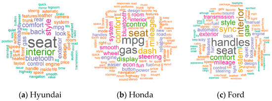Figure 7 shows the best features of three cars. Words with the highest co-occurrence are represented in this word cloud, with the most frequent and important words located in the center and the least frequent words located on the edges. Hence, the closer the words are to edges, the less frequent they are. In the case of Hyundai, “seat” is the most frequent word, followed by “interior,” then “style,” and then the rest. In the case of Honda, the most frequent words are, in order, “mpg,” “gas,” “seat,” “comfort,” “mileage,” “dash,” “control,” “display,” “smooth,” “steering,” “wheel,” “econ,” “fun,” and so on. In contrast with Hyundai, where the main advantage was design and style, consumers mostly emphasize characteristics related to value, technology, and movement on a road. In the case of Ford, the most frequent words are “handles,” “seat,” “interior,” “system,” “sync,” “style,” “comfort,” “gas,” “transmission,” “exterior,” “mileage,” and so on.