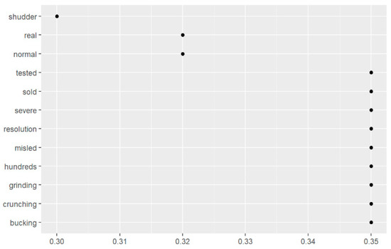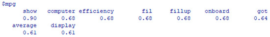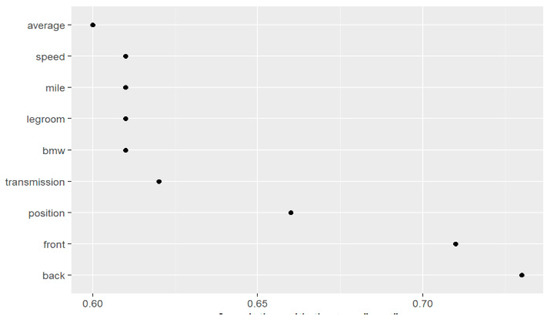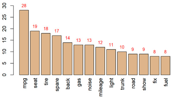 Moreover, if we consider the correlation analysis for “mpg” in Figure 12, we can see that there are highly correlated words such as “show,” “computer,” “onboard,” and “display.” Therefore, we assume there might be some problem related to displaying the mpg on the onboard computer. This hypothesis was checked manually, and it was found that many consumers were complaining about an incorrect mpg display.
