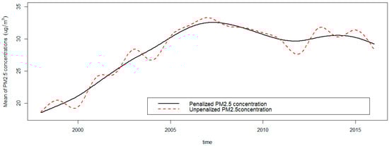 As a rule of thumb, it is safer to smooth only when necessary if we want to retain the maximal information [,]. In order to verify the necessity of roughness penalty in reconstructing PM2.5 concentrations functions, we firstly select the optimal smoothing parameter which minimizes the GCV. Figure 1 shows how the GCV criterion varies as a function of for the mean of PM2.5 concentrations. The minimizing value of is found to be 1.25, and at that value . Next, we plot the penalized PM2.5 concentrations curve with the selected smoothing parameter, and the comparison object, that is the mean of un-penalized PM2.5 concentrations curve without roughness penalty, is also plotted in Figure 2. Taking the trajectory of the penalized curve as benchmark, we can clearly see that the mean of PM2.5 concentrations experienced a fluctuation, increased rapidly and then declined slowly, and reached its maximal value round 2007. Though there is a slight rebound during the descending process, the PM2.5 concentrations kept a downward trend at the end of the research interval, which can be attributed to the synthetic effect of environmental protection policies []. In contrast, the trajectory of the un-penalized PM2.5 concentrations curve fluctuated frequently with a cycle about every two years, but the dominant changing trend of PM2.5 concentrations was obscured by those slight fluctuations with various amplitudes. Thus, we decided to smooth the PM2.5 concentrations with a roughness penalty at the value of .