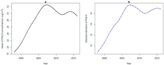 The reliable data source of PM2.5 concentrations is crucial for this study. After China’s Ministry of Environmental Protection issued the new environmental air quality standard in February 2012, local governments began to routinely record and release the data of PM2.5 concentrations. Due to lacking data of a long-term time span, it is difficult to extract the dominant patterns of evolution for PM2.5 concentrations. Besides, because the number of ground monitoring stations is small and its distribution is uneven, the rough reflection using sparse points to denote the whole area cannot exactly measure the real situation of PM2.5 concentrations. In order to solve the data deficiency of historical and regional PM2.5 concentrations, this paper adopts the data sets regarding the raster data of the annual average PM2.5 concentrations at a global level using satellite-based environmental surveillance, which is published by the socio-economic research center at Columbia University. The data sets used here are obtained from the study by van Donkelaar et al. (2016) [], which had calibrated each AOD source using AERONET observations. Based on the data sets, using geographic information system technology, we could obtain the corresponding raster data of the annual average PM2.5 concentrations in China for the period 1998–2016. Notably, however, compared with that directly from actual monitoring data on the ground, although the data sets collected from satellite-based monitoring process could be affected by meteorological factors, which thereby led to a lower accuracy, the data sets from actual monitoring data on the ground could only roughly provide PM2.5 concentrations in a region using area object other than point one based on point source data, and thus it’s difficult to accurately measure global PM2.5 concentrations in the region. Being an important non-point source data, satellite-based monitoring data sets have more advantages than the traditional methods in terms of reflecting the value of the PM2.5 concentration and its change trend in a region. Actually, the research based on satellite-based monitoring data has won the recognition of the academics, owing to the works of Nordhaus et al. [,], who won the Nobel Prize Economics in 2018. Thus, the satellite-based monitoring data employed by this study is reliable. Additionally, from the technical perspective of empirical analysis, FDA owns the congenital advantage of modeling noisy data when smoothing with roughness penalty, even when the data is sparse or sampled unequally. Thus, having combined the reliable data source with the advanced methodology, it is reasonable to draw reliable conclusions.