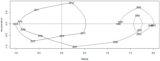 Information about the first and second derivatives from the smoothing function can give information on the rate of change and the acceleration in PM2.5 concentrations according to time compared to the traditional multivariate statistical approaches which could not possibly capture this kind of information [,]. In order to dynamically analyze the evolving process of PM2.5 concentrations from 1998 to 2016, we can extract more information by studying how derivatives relate to each other, which is often called a phase-plane plot (PPP) []. The energy transferring between the first order derivative of PM2.5 concentrations which is called average velocity and the second order derivative which is called average acceleration, was shown in Figure 4. The numbers along the curve indicate the year of PM2.5 concentrations. The trajectory of PPP exhibits several interesting features. There were two obvious cycles of energy transferring between velocity and acceleration, with the year 2007 as a landmark. During the first cycle, although the sign of growth acceleration for PM2.5 concentrations alternated from positive to negative frequently, the growth velocity remained positive all the time, and the largest growth velocity occurred between 2001 and 2002. During the second cycle from 2007 to 2016, both the sign of growth velocity and acceleration alternated between positive and negative, with a larger oscillation. The first cycle corresponded to the period during which the decoupling indicators of China’s resources consumption and GDP growth is much lower. The key reason for this phenomenon is that China was in the process of industrialization, particularly in the process of heavy industrialization, which caused the rapid growth of infrastructure construction and consumed vast amounts of basic materials. The second cycle corresponded to the period during which the PM2.5 concentrations fluctuated with a high frequency, due to the intensive formulation and implementation of environmental protection policies.