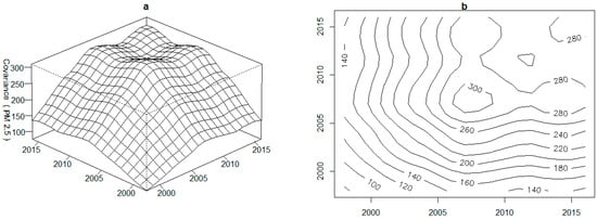 (a) Estimated variance surface of PM2.5 from 1998 to 2016 and (b) the corresponding contour map.