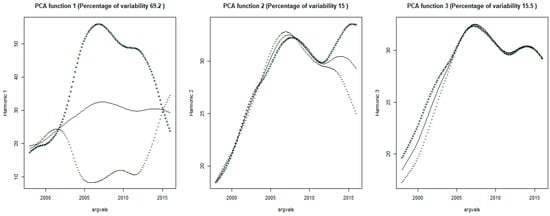 As one of the most important advantages for FDA, the temporal variance-covariance surface as well as the corresponding contour in functional data gives new ways to gather information, more than a single value or matrix obtained in the traditional univariate and multivariate contexts []. The estimated variance surface of PM2.5 concentrations from 1998 to 2016 with its corresponding contour plot are presented in Figure 5. We can see the variability becoming larger and larger since 1998, and the highest variability occurs around 2007, the period which also corresponds to the highest mean of PM2.5 concentrations. In order to further explore the potential variation from curve to curve, we employ functional principal components analysis (FPCA) to decompose the covariance function. Figure 6 displays the result of covariance decomposition via FPCA for PM2.5 concentrations after varimax rotation. For each of the first three principal components, three curves are plotted. The solid curve is the overall smoothed mean which is the same in all provinces just for reference purposes, and the other two curves show the effect of adding and subtracting a suitable multiple of the principal component weight function. The accumulative percentage of variance explained by the first three components is 99.7%, indicating that there was almost no valuable information lost.