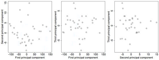 In order to visually explore how curves clustering within the three-dimensional subspace spanned by the first three principal component functions, Figure 7 displays the scatter plots of scores on pairs of weight functions for each province. It shows that there is essentially no correlation among these scores, so the three principal components can be considered as uncorrelated variables within 34 provinces. Although the three scatter plots show no very distinctive features, the distribution range for each of the three component differs vastly. It can be seen that the scores on the first principal component ranges from about −100 to 150, with a considerable lager amount of variability. However, the scores on the other two components distribute with a nearly equal range, which is far less than that of the first component. In view of the vast disparity of information amount, different weights for the three principal components should be taken into account when employing clustering analysis to classify the categories of fluctuation.