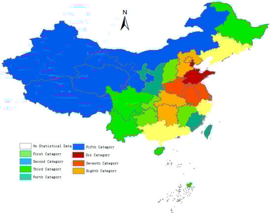 Since the PM2.5 concentrations usually originate from multiple sources, besides motor vehicle usage and static atmosphere flow, we focus on tracking the major cause for regional difference in PM2.5 concentration from the perspectives of industrial activities and energy structures. According to the spatial distribution of each group in Figure 9 and data from the “Statistical Yearbook of China (1998–2016)” [], we found that the provinces with highest level in groups six, seven and eight were mainly located in the Beijing-Tianjin-Hebei region and the Yangtze River Delta region, as well as their surrounding provinces. As is well known, the above regions are the leaders in social and economic development in China, and their prosperity was established on the massive consumption of fossil fuels (coal and oil), especially in colder seasons. The sources of PM2.5 in Yangtze River Delta could be attributed to the secondary pollution and active economic activities. Actually, most of traditional manufacturing industries, such as electronics industry and transportation service, located at Yangtze River Delta in China, and a large labor force including ordinary workers and high-tech talent resides in this region. The labor-intensive industries whose layout focused on upstream and intermediate products of industrial chains, produced large quantities of volatile organics, which are the main components of PM2.5 in Yangtze River Delta. Besides, the global night-time light data from 1992 to 2012 indicates that the Yangtze River Delta is still the most active economic area []. According to environmental statistics from 1998 to 2016 [], the proportion of fumes, such as SO2 and NOx, discharged from vehicles is closing in on that from factories, and have an exceeding tendency. After chemical reactions in atmosphere, the fumes transmuted into smaller particulate pollutants, such as sulphates and nitrate. Although the pollutants from factories are declining due to the campaign of “Desulphurization and Denitrification” launched in all industrial sectors, the growing number of vehicles is increasing the emission of pollutants in the Yangtze River Delta of China.