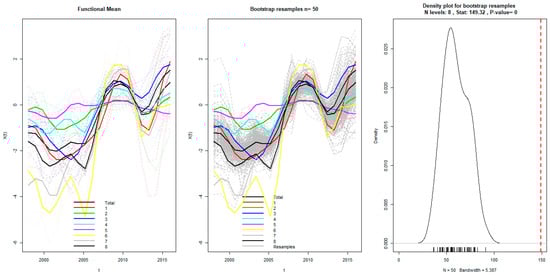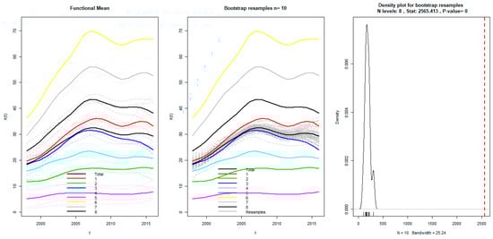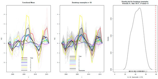 Given the null hypothesis of having the same functional means for each i group, that is, , calculate the critical value and at the specified significance level respectively. should be rejected if the variability between groups, which are measured by the difference in the sample means and , is large enough to be expressed as and . In other words, the test is found to be statistically significant if the p-value is less than the α significance level. The detailed steps of algorithm can be found in Cuevas et al. (2004) []. This procedure uses a point-wise critical value obtained using a permutation test for reference lines [].