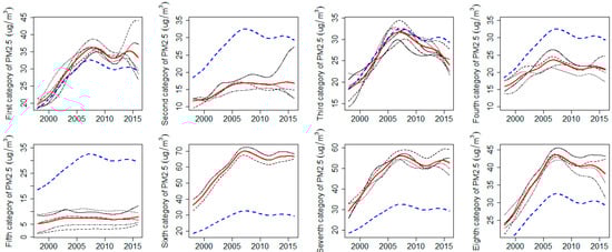 Due to multiple differences in industrial structure and topography, together with the different coping strategies toward influence of various environmental policies, the fluctuation process of PM2.5 concentrations between provinces has typical category features. In order to interactively display the disparity of fluctuation process, we have taken the overall mean function of China as the benchmark for comparison (blue dashed line), Figure 13 displays how the PM2.5 concentration functions vary from province to province, with the mean function of each category in a red solid line. From the perspective of absolute level, we can see the average value of PM2.5 concentration for the sixth, the seventh and the eighth category far outweighed the overall mean and their highest value occurred around 2007. However, the average value of the second, the fourth and the fifth group is far less than the overall mean, especially the fifth group which exhibited nearly a horizontal fluctuation trajectory, meaning that there were almost no substantial changes in the PM2.5 concentration fluctuations. The mean curves of the first and the third category seemed to be overlapping with the trajectory of the overall mean, indicating that the level of PM2.5 concentration for the two categories represented the overall situation of PM2.5 concentration in China.
