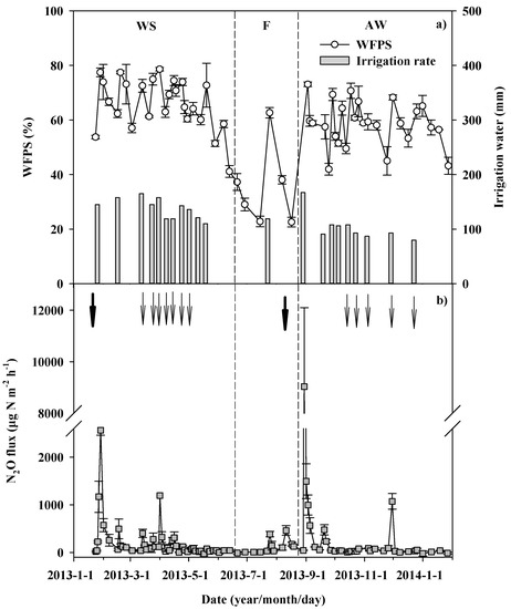 3.1. Soil Moisture and N2O Flux during Field Observation