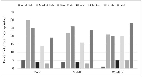 Fish is often considered to be a ‘rich food for poor people’ []. Fish is the most accessible and affordable source of animal protein, providing many of the key nutrients and calories that are needed for physical and mental development []. For example, analysis by [] on the consumption patterns of different types of proteins in Kenya show that wild-caught, followed by pond fish, make up a large proportion of the total protein that is consumed by respondents from ‘poor’ socioeconomic classes (Figure 1). The results further indicate that as households become wealthier, “terrestrial sources of animal protein” (e.g. chicken, beef, mutton and pork) occupy increasingly larger shares of total protein consumption. Conversely, as socioeconomic status declines, fish becomes increasingly important. This implies that the poorer the households, the more important fish is to their total protein intake. Therefore, [] concluded that although formidable fish supply chain issues remain, many families—including poor families—had attained meaningful food security benefits from aquaculture. As a result, more action is needed to address the economic constraints that are plaguing the sector.