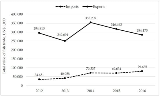 Fish and fishery products remain the most well traded food items worldwide [,]. International trade is crucial to the fisheries sector, especially in the least advanced economies, through the creation of employment, supplying food, generating income, and thus contributing to maintaining food and nutrition security [,]. According to [], about 35% of the world’s fish production is traded internationally for human consumption and non-edible purposes. Over the past 40 years, the trade in fish and fish products increased significantly in value terms, from US$8 billion in 1976, to US$143 billion in 2016 []. Approximately half of the fish consumed by developed country markets, like the United States (US) and the European Union (EU) originates from developing countries [].