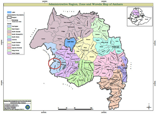 Fieldwork and visits with farmers and small handicraft processors were limited to the town of Injibara and its surrounding regions. The township of Injibara is located in the northern highland of Ethiopia, situated 447 km north of the capital city, Addis Ababa, and 118 km south of Bahir Dar, another major city in Ethiopia. This region receives around 2500 mm of annual rainfall. Due to its high altitude location and climate, the major crops that grow in this area are predominately teff, barley, peas, and potatoes. Injibara is well-connected to nearby towns and markets, with easy access to transportation and well-paved roads for the movements of products from production to consumption [20]. Figure 3 shows a map of the Amhara region. The study area is identified with a red circle.
