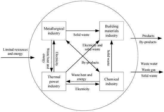 At the level of energy-intensive industry, the eco-efficiency system of a single energy-intensive industry is composed of enterprises in this industry. Resource investment mainly includes energy resources, capital investment, and labor input, reflecting material, financial, and human input. Pollutant emissions mainly include sulfur dioxide emissions, industrial waste water discharge, and waste residue and other solid waste emissions. Resource input and waste emissions are the price that enterprises pay for product value. However, due to the similarity of all business types within the single industry and the extremely short industry chain, only a very small proportion of resources can be integrated and reused within the enterprise or industry, so that most of the by-products, residual heat, and residual energy cannot be used effectively.
