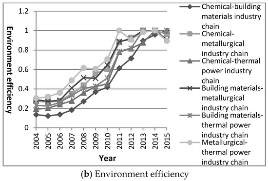 As can be seen from Figure 3a,b, the resource efficiency and environment efficiency of four energy-intensive industries are generally on the rise, but with greater volatility. In terms of resource efficiency, the average values of the chemical industry and building materials industry are 0.702 and 0.797; they are at a better situation of development, which is significantly higher than the metallurgical industry and thermal power industry, which have values of 0.575 and 0.583, respectively. The chemical industry and building materials industry use raw materials sourced by upstream suppliers, as well as chemical by-products produced by metallurgical industry and thermal power industry, such as sulfuric acid and solid waste. That means that the chemical industry and building materials industry have strong capabilities regarding the absorption and utilization of resources. As for environment efficiency, the average values of the metallurgical industry and thermal power industry are 0.691 and 0.690, respectively. They are both at a better level, which is significantly higher than the averages of the chemical industry and building materials industry, which are 0.529 and 0.483, respectively. The reason is probably that the industrial waste water and industrial waste residue produced by the metallurgical industry and thermal power industry can be used as cooling water and production materials for other industries. Meanwhile, the chemical industry produces a large amount of waste, and its pollutants generally have a high risk, most of which cannot be recycled, resulting in a higher degree of environmental pollution, and thus a lower level of environment efficiency. The building materials industry can use waste from other industries to produce its products, but their own waste is difficult to be used by other industries; the majority of waste is released into the natural environment, resulting in the low environment efficiency of the building materials industry.