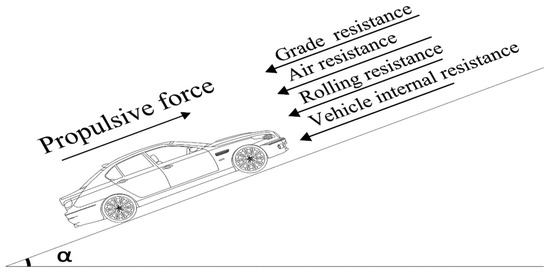 where W is the total required propulsive force, is the gravity resistance force, is rolling resistance force of moving vehicle, is air resistance force, m is mass of vehicle, is gravitational acceleration, is rolling resistance coefficient, is grade angle, Af is a front area of the vehicle, is the air density of the vehicle, is the drag coefficient, and V is the vehicle speed.