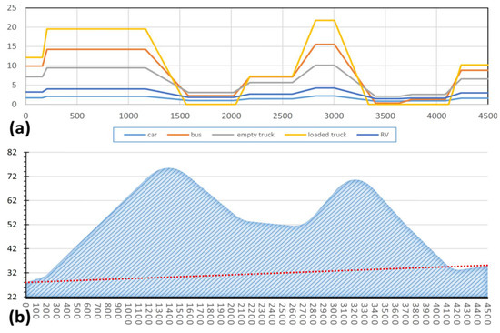 There exist five categories of car—Recreational Vehicle (RV), bus, empty truck, and loaded truck—that are defined for different vehicle weights and characteristics. In the proposed model, it is also assumed that the vehicle moves with constant cruise speed. In order to neutralize friction and gravity forces, there is a need for a compensating force to maintain the constant speed. Figure 3 shows the change of needed propulsive force in a route with a sample longitudinal profile for five different vehicle types. The model shows that for heavier vehicles in steep upward slopes the needed propulsive force increases sharply (see the propulsive force for loaded truck between 2 + 600 and 2 + 700). In contrast, in steep downward slopes, a need for braking action exists for heavy vehicles. The red dotted line shows the minimum average grade which imposes minimum fuel consumption cost.