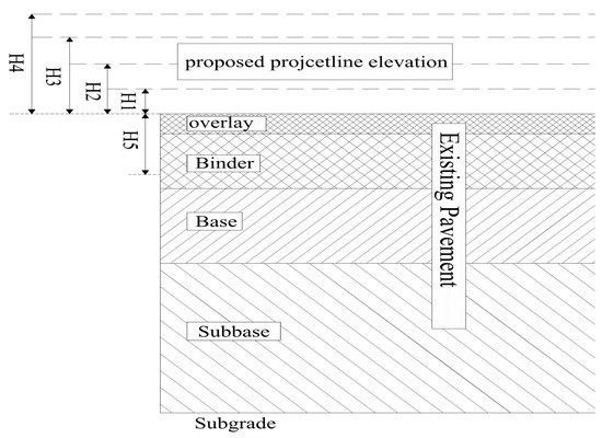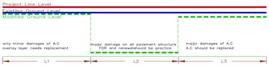 This research proposes a new model for the existing pavement structure. Therefore, selecting and estimating construction means and methods are more complicated in comparison with the new construction. Pavement reconstruction design depends on two main factors: (1) the difference between a new project line (PL) and existing ground (GL) and (2) existing pavement condition. Both of these two factors are important to choose a rehabilitation strategy. Figure 4 schematically shows the layers of existing pavement and its condition over new PL. The position of different PLs in comparison with existing pavement layers is shown in this figure.