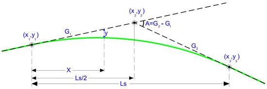 The main components of a vertical alignment in the geometric configuration are grades (upgrade and downgrade) and curves (sag and crest). These curves, based on applicability, have circular or parabolic equations. For roadways, the parabolic curve is used with an equivalent vertical axis centered on the vertical point of intersection. If the outward tangent of the curve has a greater value than the inward grade, the curve is concave (sag); otherwise, it is considered a convex (crest) curve. Figure 6 shows the configuration of the parabolic longitudinal curve.