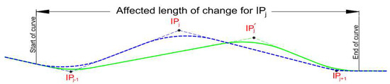 As is shown in Figure 7, the change of IPj affects the adjacent tangents gradient, i.e., IPj−1 and IPj+1 (and therefore curve length). To adopt this change, the new curve length (Ls2) would be