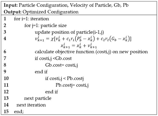 The developed matrix in the previous section is completed in cyclic iterations. In each iteration, Gb among all particles and the Pb of each particle should be updated and, accordingly, the movement equation for each particle changes during the evolution of solutions. Figure 10 shows the optimization procedure.