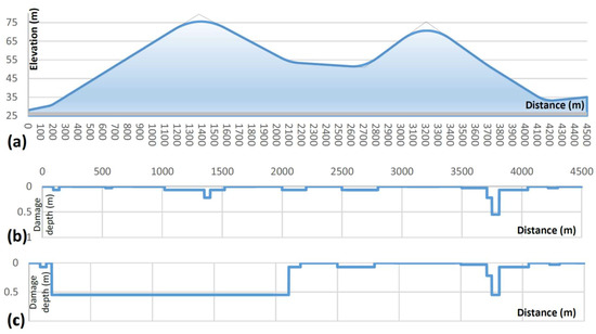 Vertical alignment of existing road (a) and pavement deteriorated depth in the first (b) and second (c) case studies.