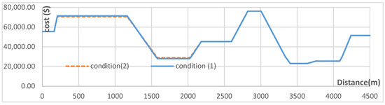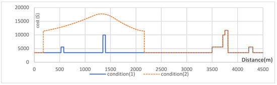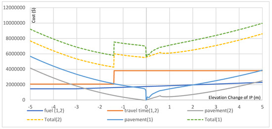 To achieve a better understanding of the variation trend for cost variables, a sensitivity analysis was conducted for these two conditions. These cases, which have been previously introduced, have been shown in Figure 14 with (1) for the first and (2) for the second case study. The sensitivity analysis performed with changing the geometric configuration of the longitudinal profile with altering one IP’s elevation. The third IP, which is located at (1 + 375) km of the existing roadway, was moved vertically between (−5, 5) m with 1 cm increment. In both cases, the pavement conditions have two different pavement conditions of good and deteriorated. Figure 15 shows the trend of change in the variables. Due to the same geometric condition, the function for fuel cost and travel time cost is the same in both conditions, but there are two pavement cost functions. The total cost is also shown for both conditions. The cost functions used in the proposed model are the costs depend on the geometric changes of the roadway.