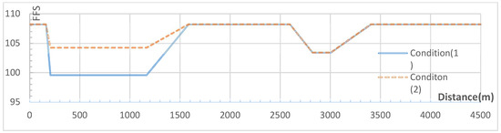 The optimized solution in the first condition lies on the existing ground. Since there is a relatively good condition for most of the segments of the pavement, changing the project line imposes a high cost on road rehabilitation practice and, consequently, this change was limited. In contrast, in the second case, where there is a deteriorated pavement condition between stations (0 + 185) to (2 + 105), this high sensitivity of change did not exist. Hence, there is a tendency of alteration to reduce the slope and positive effects on fuel consumption cost and travel time cost of the road. Figure 12 shows a minor reduction in fuel consumption but a major change in Free Flow Speed of vehicles between (0 + 185) to (2 + 105), as shown in Figure 13.