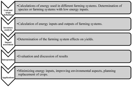 An outline could be applied by adopting a modified, for agricultural production, life cycle assessment (LCA) methodology to assess energy use [29,63,73,74,82,83], which could involve the five stages, as shown in Figure 1.