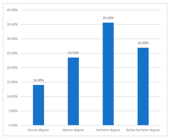 In order to ensure the pertinence and validity of the questionnaires, Ciqikou, a famous AHT in Chongqing, was selected as the reference for respondents to state their attitudes. It was founded in Song dynasty and was identified as a national folk ancient town and tourist attraction. The state-of-the-art of Ciqikou can basically reflect the actual situation of ancient towns of China. Therefore, the questionnaires were distributed by email and field investigation to employees who work for local government departments, profit-making and non-profit organizations related to Ciqikou, experts in this area, as well as local residents. As a result, a total number of 375 responses were received, with 18 invalid questionnaires which were missing some important information. Therefore, the remaining 357 respondents were retained for further analysis. All the respondents had different positions, from ordinary employees to senior executives, which ensured the comprehensiveness of the statement on the importance and enthusiasm of architectural heritage stakeholders. Moreover, the distributions of respondents’ position and education background are shown in Figure 1; Figure 2, respectively. As can be seen from these two figures, more than half of the respondents (55.2%) had a middle-level management position and 73.1% had an undergraduate education background and higher, which demonstrated that most of the respondents had extensive experience and in-depth understanding of the SD of AHT. In light of respondents’ experience, education background, and the scope of the survey, their statements were respective for the study for ensuring the reliability of the research results.