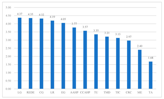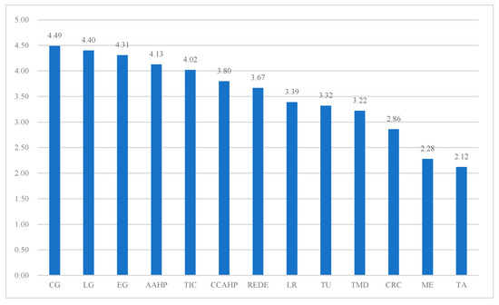 The importance ranking of all 13 stakeholders. Note: LG—local government; REDE—real estate development enterprise; CG—central government; LR—local residents; EG—expert group; AAHP—administration of architectural heritage protection; CCAHP—construction company of architectural heritage protection; TU—tourists; TMD—travel management department; TIC—travel investment company; CRC—community resident committee; ME—media; TA—travel agency.