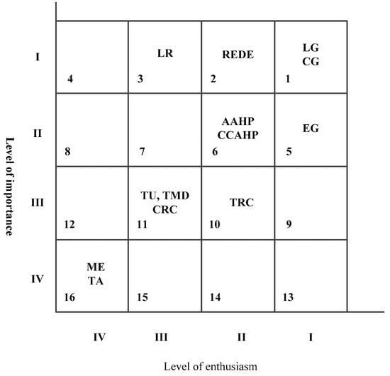 On the basis of considering the classification of stakeholders’ importance and enthusiasm, a matrix which includes sixteen boxes was obtained, as shown in Figure 6. The horizontal axis of the matrix demonstrates the level of importance of enthusiasm with an increasing trend from the origin of coordinates. The vertical axis shows the level of importance of stakeholders with an increasing trend from the origin of the coordinates. Each box in this matrix represents the different level of stakeholder’s importance and enthusiasm in the SD of AHT. All the 13 stakeholders were grouped into eight kinds of boxes (see Figure 6). For example, if the stakeholder has an importance of category I and an enthusiasm of category II, it will be put into box 2.