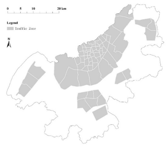The household-related data and individual trip data used in this study were obtained from the household travel survey conducted in the Jiangning District of Nanjing, China, in 2014. Jiangning District, located in south of Nanjing, is the largest district in Nanjing with a total area of 1577.75 km2 and 1,183,200 residents in 345,255 households at the end of 2014 (see Figure 1). The grey blocks in Figure 1 represent the division of Traffic Analysis Zone (TAZ) in the area of urban construction land. TAZ is the geographical division system developed specifically for transportation planning [20]. The questionnaires were developed by the research group of the urban transportation planning of Jiangning District of Nanjing City. The surveys were conducted by the research group for developing the transportation planning of Jiangning District. In the household travel survey, a total of 2802 household questionnaires were qualified for the following data analysis. The surveyed households were well distributed across the whole Jiangning District.