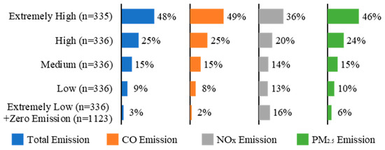 Based on the total emissions, the households were classified into six groups, including the extremely high (n = 335), high (n = 336), medium (n = 336), low (n = 336), extremely low (n = 336) and zero emission (n = 1123) group. As shown in Figure 2, the 335 households from the extremely high group contribute the 49%, 36% and 46% of the CO, NOx and PM2.5 emissions in the whole sample respectively. While the 1459 households from the extremely low and zero emission group only account for the 2%, 16% and 6% of the CO, NOx and PM2.5 emissions in the whole sample. This indicates the imbalanced distributions of emissions over households. What needs to be explained is that for the households from the low and extremely low emission group, the percentage of NOx emissions is obviously higher than the percentages of CO, and PM2.5. The reason is that the low-emission households are more likely to travel by bus. NOx emissions are mainly generated by diesel vehicles like buses.