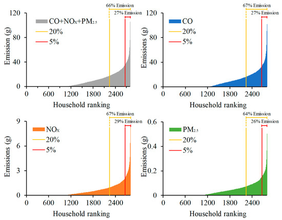 (1) The average daily emissions of CO, NOx and PM2.5 per household for all samples are 8.66 g, 0.55 g and 0.04 g respectively. The average daily traffic emissions of CO, NOx and PM2.5 per household for the non-zero emission samples are 14.45 g, 0.92 g and 0.07 g, respectively. The household emissions were found to have imbalanced distributions over households. The top 5% high-emission households were responsible for about 27% total emissions, and the top 20% high-emission households were responsible for nearly two thirds of the total emissions.