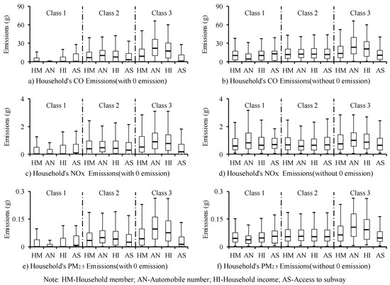 (2) The one-way ANOVA tests indicated that the means of CO, NOx and PM2.5 emissions are significantly different over households with different member number, automobile number, annual income and access to the subway. The number of household members was found to be positively correlated with all three emissions. The household automobile number and annual income were found to have positive effects on all three emissions. The households with better access to the subway do not have obvious lower daily traffic emissions.