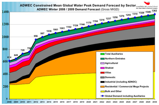 Abu Dhabi’s Water Demand Projections (in Million Imperial Gallons per Day (MIGD)). Reproduced from [5].