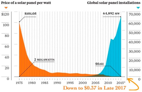 Thanks to the rapid decrease in cost and worldwide government support, solar PV has become an effective way of producing electricity in terms of cost and cleanliness from a fringe technological option 20 years ago. Figure 4 shows the exponential rise in global solar PV installations and associated plummeting costs of the technology [18].